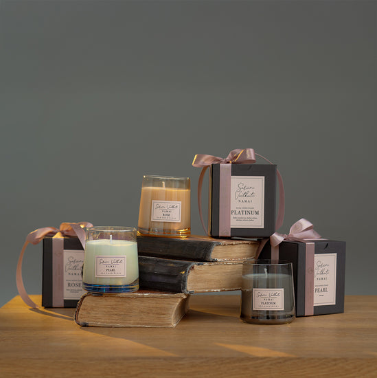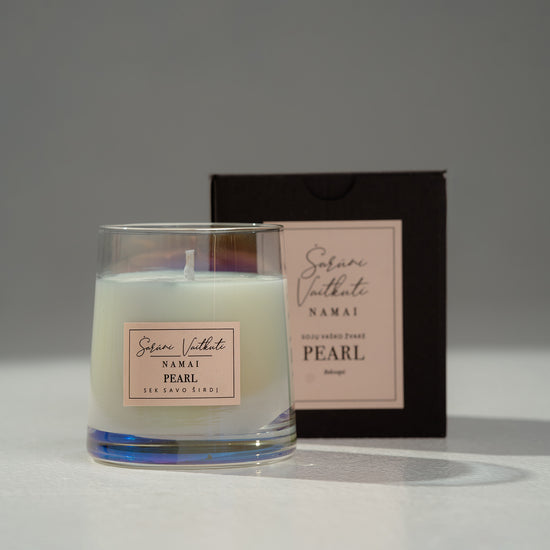 Rankų darbo sojų vaško žvakės PEARL, ROSE, PLATINUM.